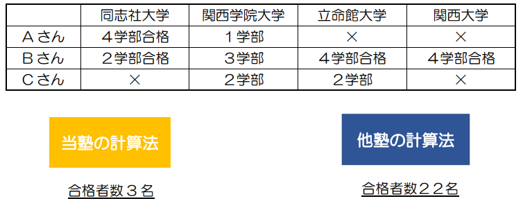 当塾の合格率は合格個数(延べ人数)ではなく、実質人数の合格率を正確に出しています。
