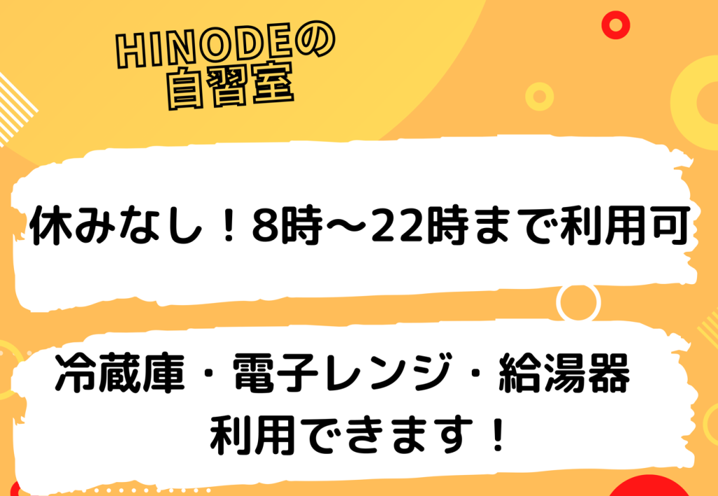 朝は何時でも、夜は22時まで利用可能です。大学受験に成功するためには、授業を受けた量ではなく、自習量が一番大事です。当塾は少しでも生徒さんが、自習に『来やすい、しやすい』環境作りを心掛けています。ぜひ毎日利用ください。