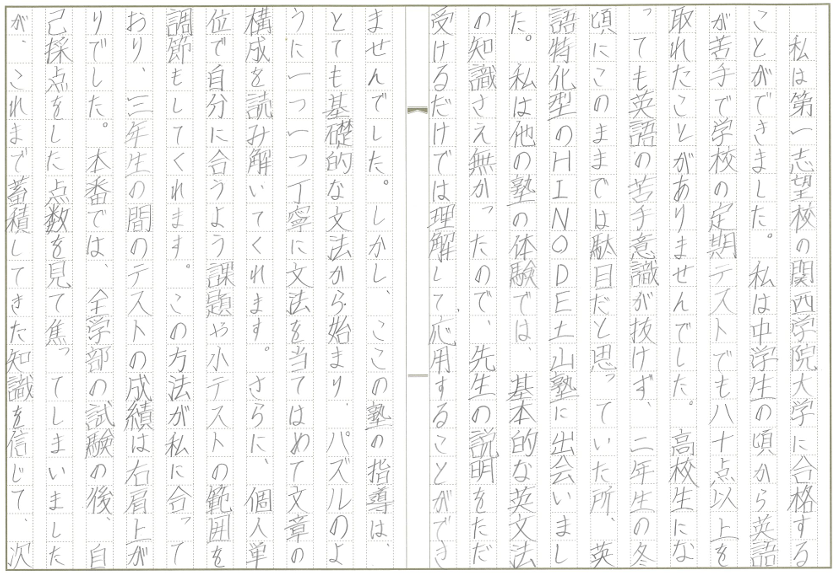 私は中学生のころから英語が苦手で学校の定期テストでも80点以上を取れたことがありませんでした。高校生にあっても英語の苦手意識が抜けず、二年生の冬頃にこのままでは駄目だと思っていた所、英語特化型のHINODE土山塾に出会いました。私は他の塾の体験では、基本的な英文法の知識さえ無かったので、先生の説明をただ受けるだけでは理解して応用することができませんでした。