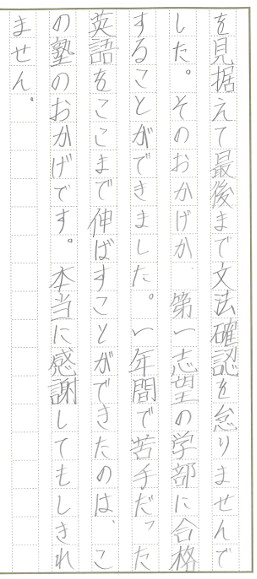 一年間で苦手だった英語をここまで伸ばすことができたのは、この塾のおかげです。本当に感謝してもしきれません。