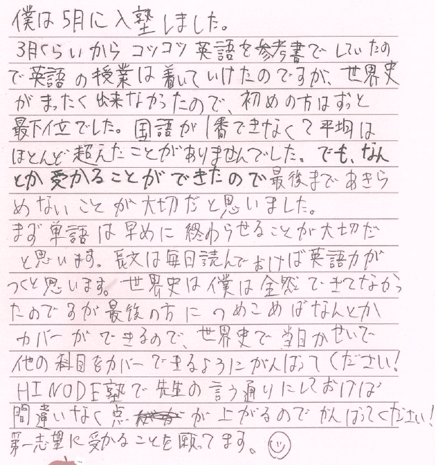 直筆の体験記です。合格おめでとう!