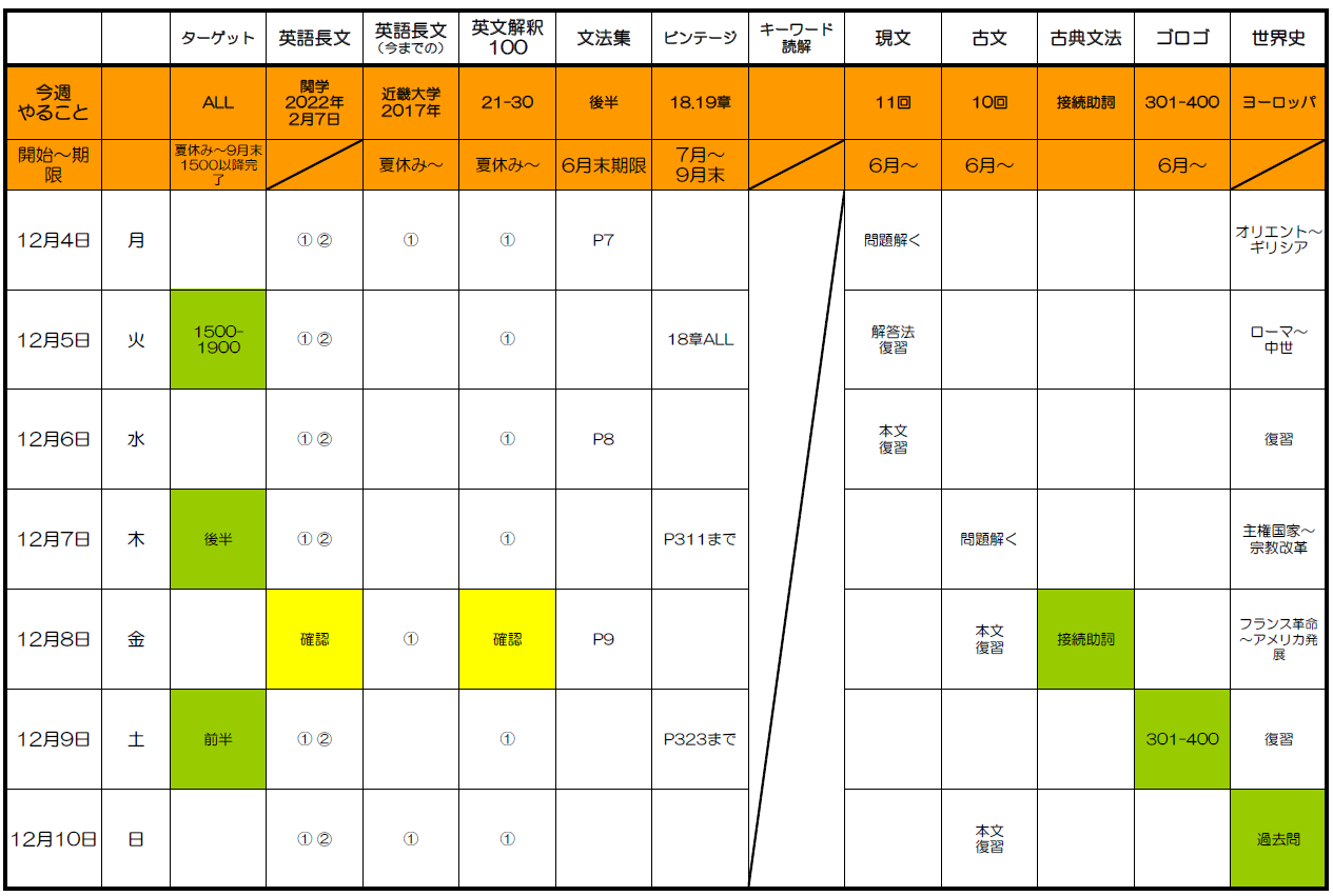 生徒一人一人に志望大学、成績にあった予定表を毎週配布します。受験失敗の一番の原因になるのが勉強ペース、科目ごとの配分です。この個別予定表をしっかりこなせば必ず合格します。